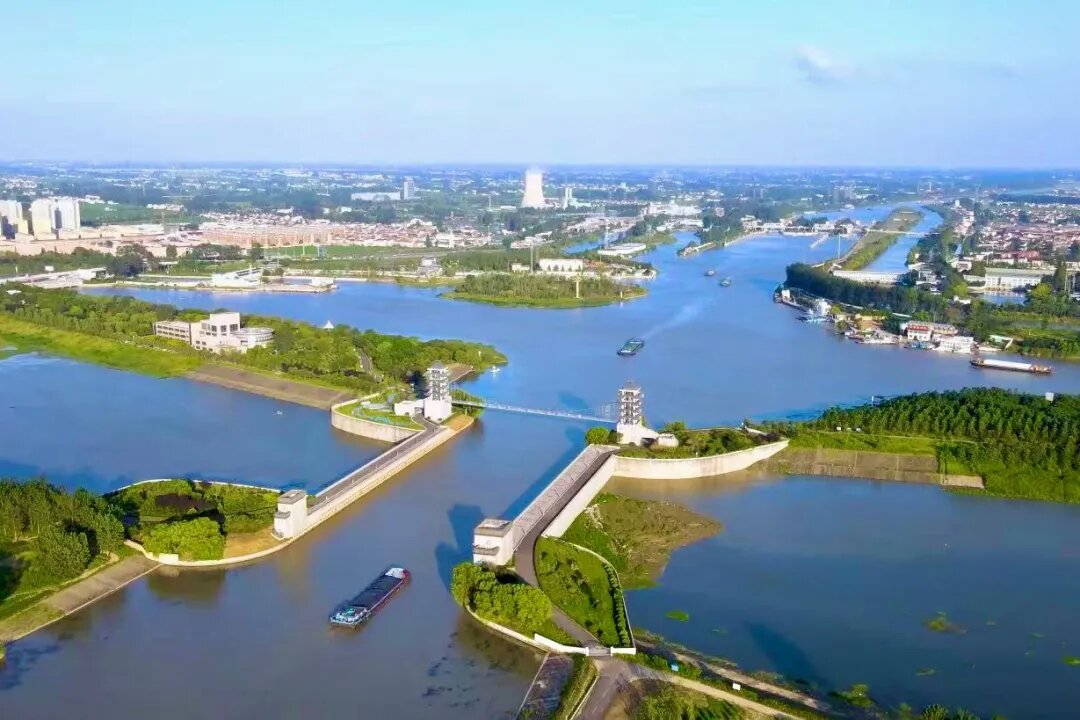 淮河入海水道近期工程西起洪澤湖二河閘,與蘇北灌溉總渠并行,東至扁擔(dān)港入黃海,全長163.5千米,設(shè)計(jì)行洪流量2270立方米每秒。淮安樞紐工程是淮河入海水道近期工程的第二級控制工程,在入海水道與京杭大運(yùn)河交匯處,是一座集泄洪、調(diào)水、排澇、航運(yùn)等多種功能于一體的大(1)型工程,其主要作用是實(shí)現(xiàn)入海水道與京杭運(yùn)河的交叉,維持京杭運(yùn)河水路航運(yùn)和南水北調(diào)輸水,滿足入海水道泄洪及渠北運(yùn)西地區(qū)排澇要求。樞紐主要建筑物有入海水道穿京杭運(yùn)河立交地涵、古鹽河與清安河穿堤涵洞、渠北閘和入海水道北堤跨淮揚(yáng)公路立交旱閘等,是亞洲同類工程規(guī)模最大且極具特色的“上槽下洞”的水上立交工程。